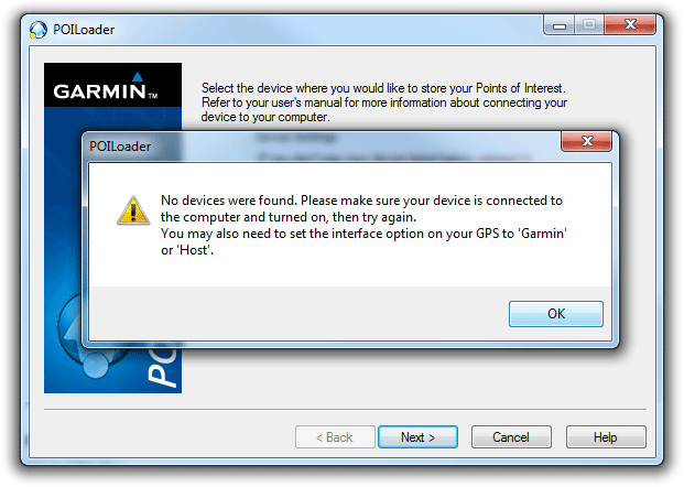 - If your Garmin device is not turned on, or the cable is not connected to your computer, you will see the below screen. Please ensure your Garmin GPS device is connected using the supplied USB cable.