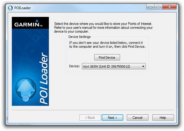 Following the program installation, a wizard will guide you through the process of adding POI locations onto your GPS Device. When you reach the screen below, please insure your GPS device is connected to your computer before proceeding.