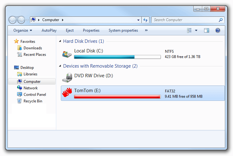 - You should now see your TomTom device listed as a Removable Drive entitled 'TomTom'. Double-click this icon to access your device.
