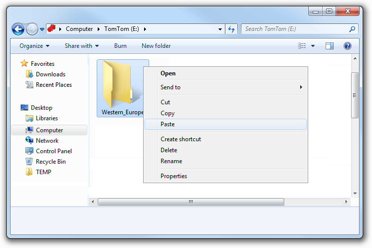 - You will now need to paste the copied file. With the mouse cursor over the folder entitled 'Western_Europe', click on the right mouse button. Now select 'Paste' from the menu.